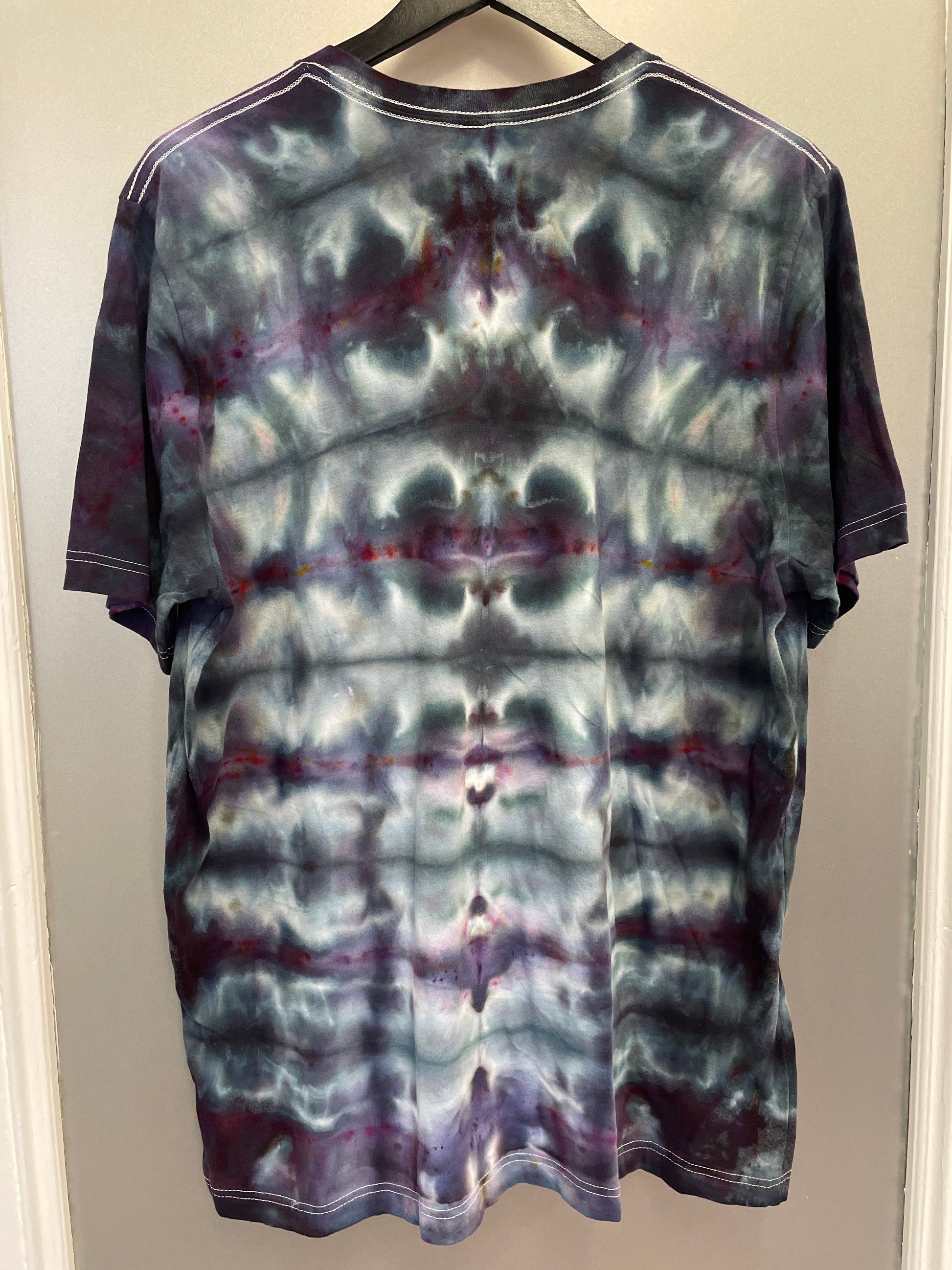 Hand dyed T-shirt 100% cotton featuring a black decal of a rock on symbol with an upside down cross. Unisex size XL.