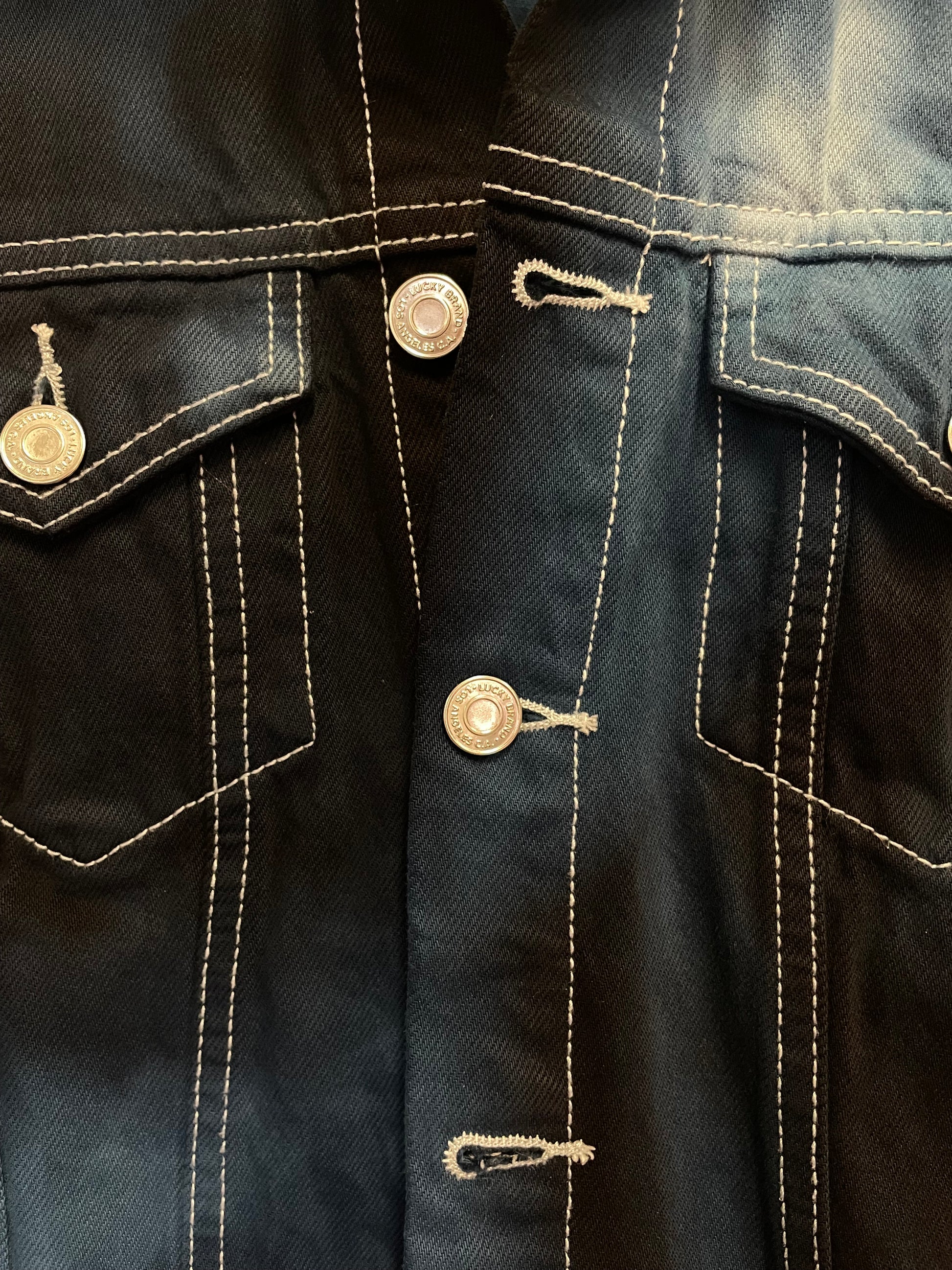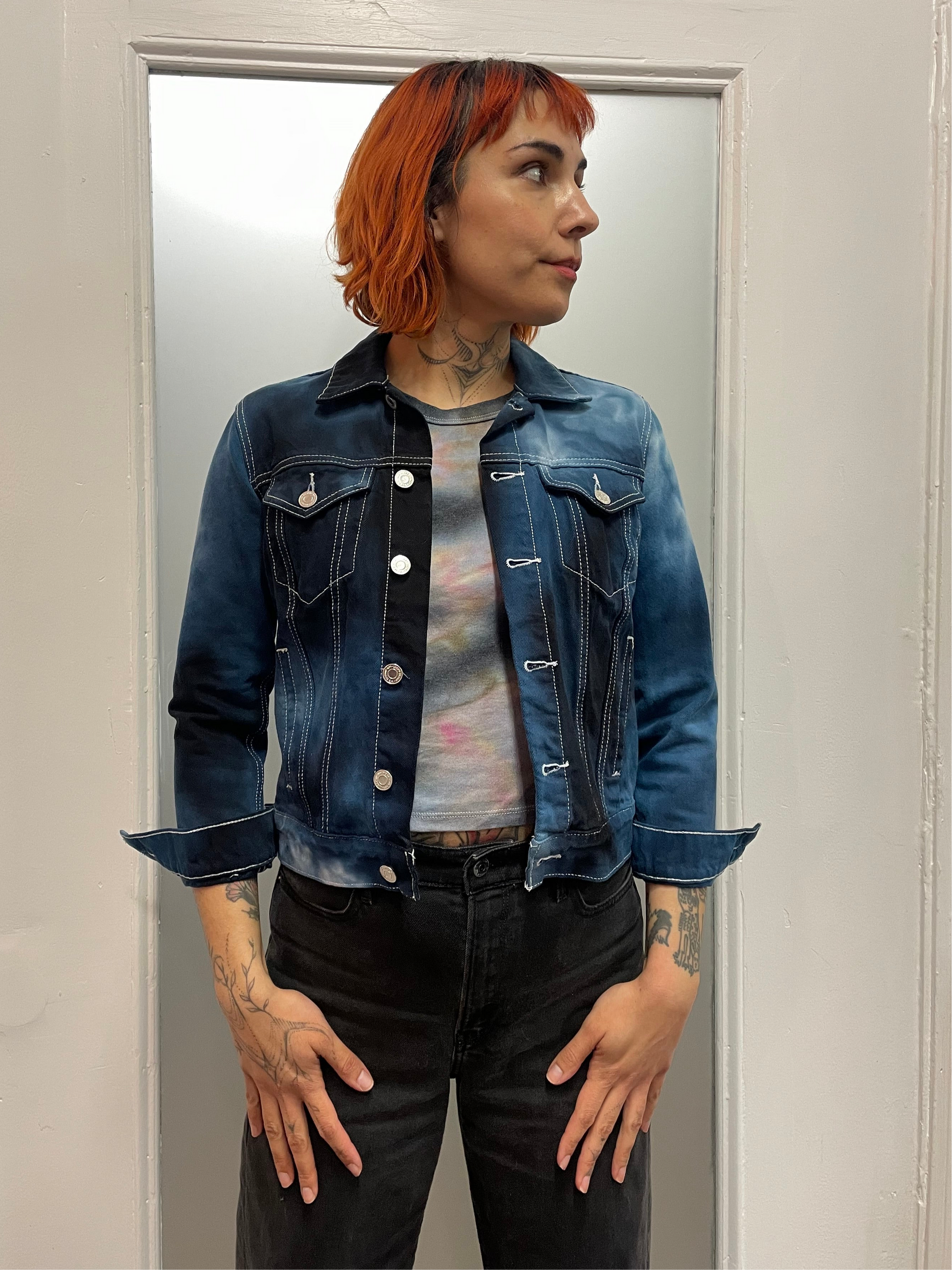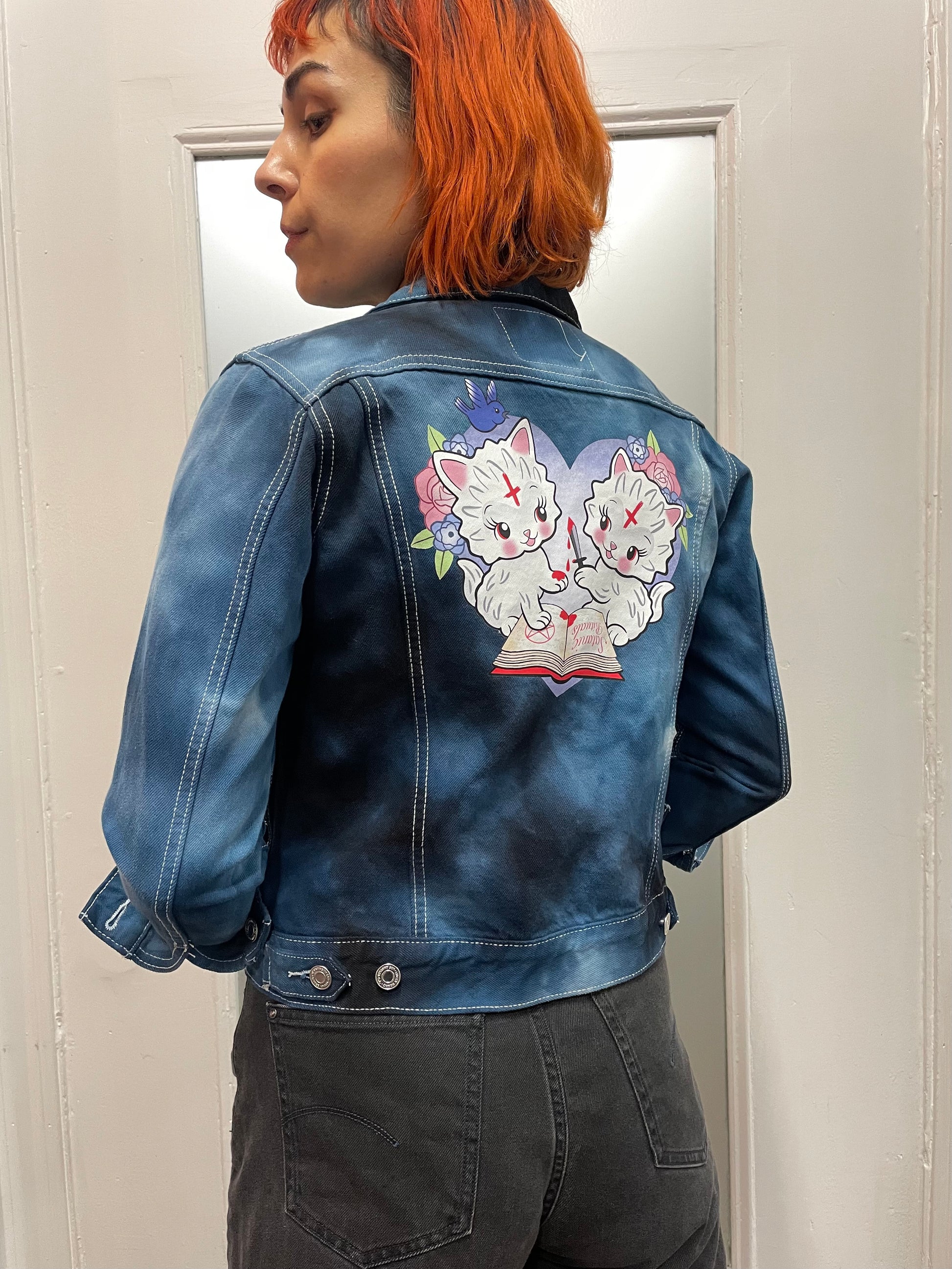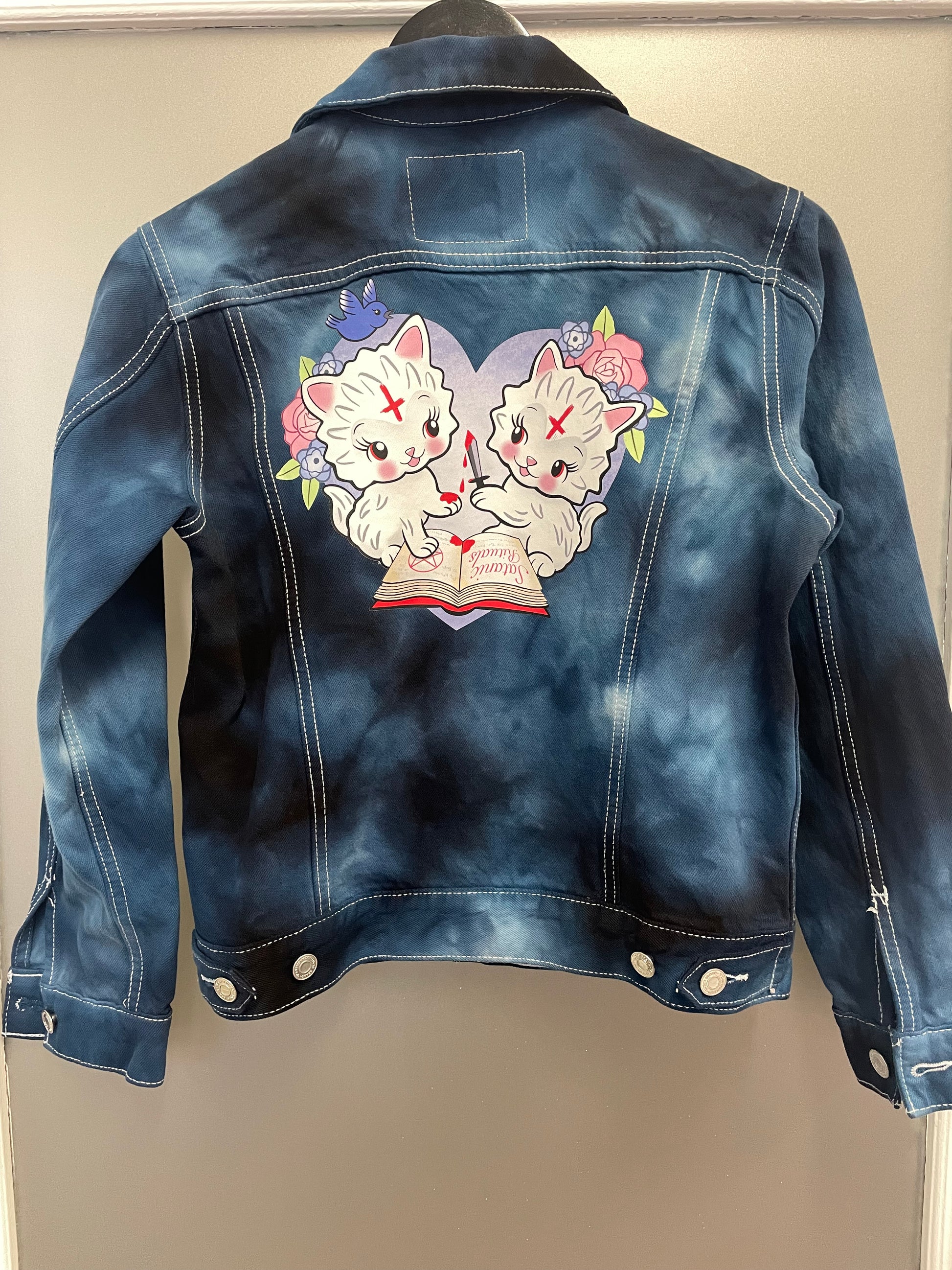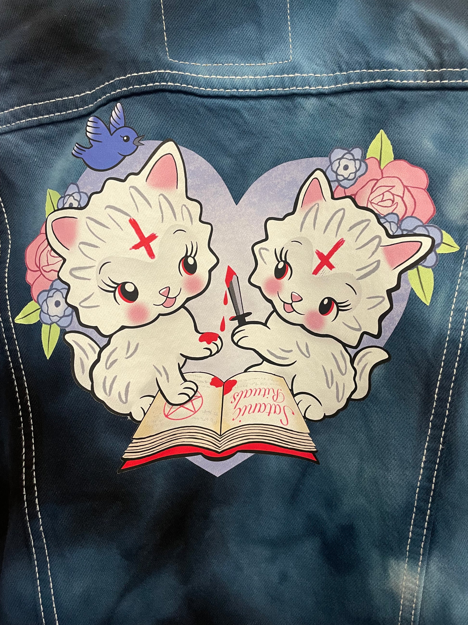 This up cycled denim jacket has been given a new life, using hand dying methods and a new appliqué. The back of the jacket features to Satanic kittens. This jacket is a women’s size small.